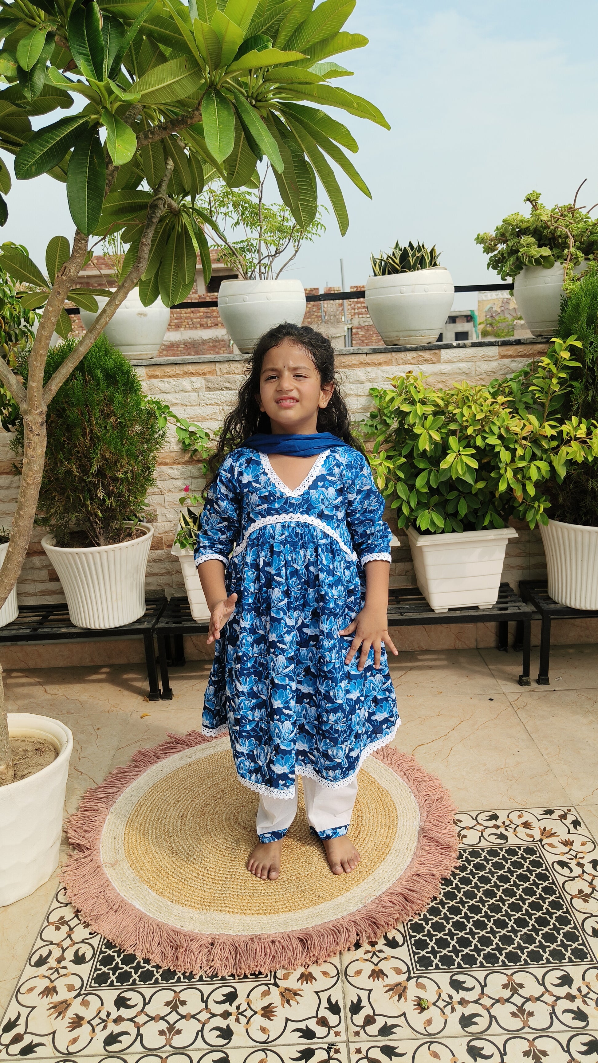 ● Kurti : Kurti featuring gathered pleats below the bust with border detailing, enhanced by white lace accents and a White embroidered or printed border around the neckline