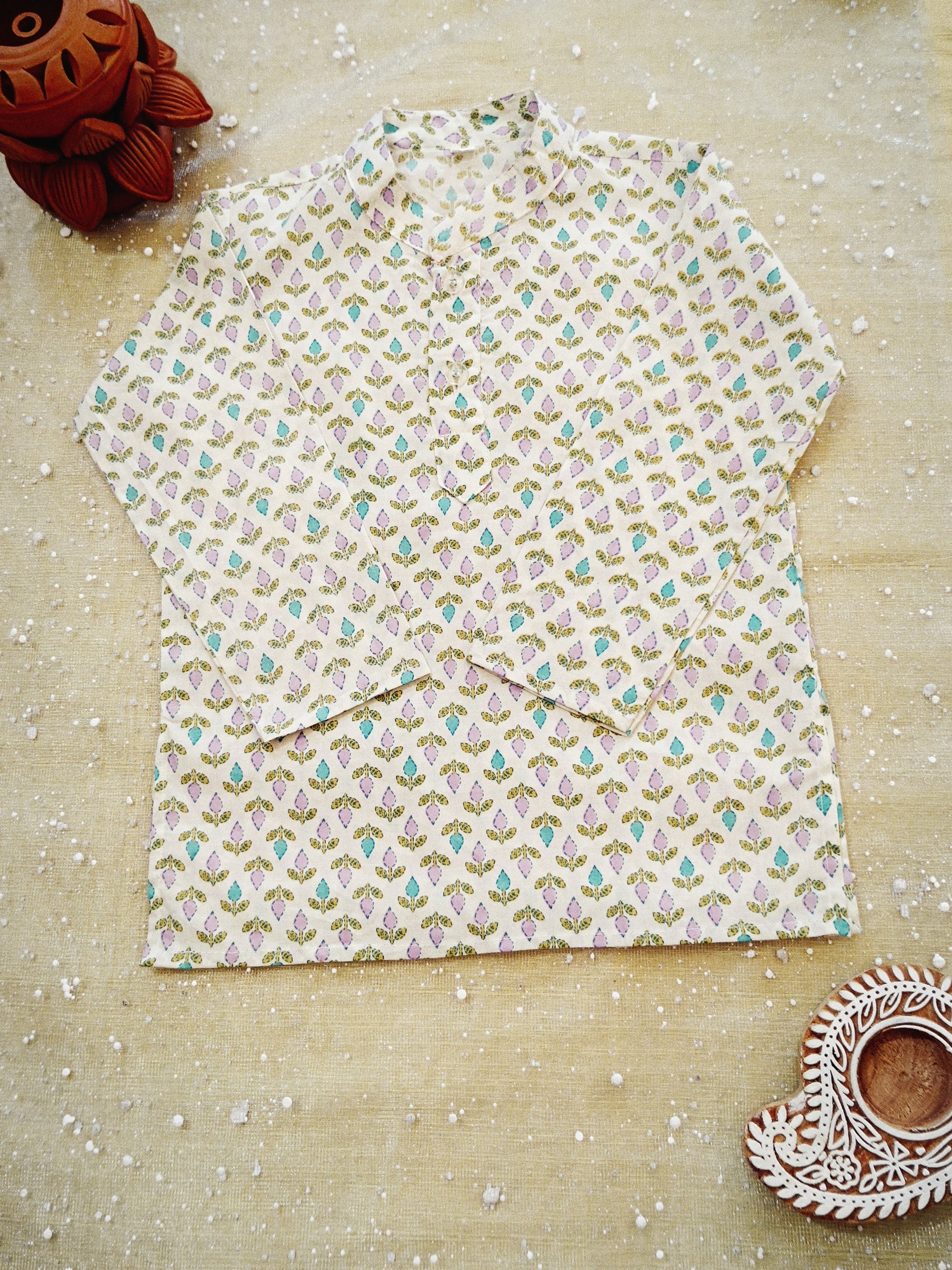 ● Kurta : Small boota printed Kurta with Mandarin collar and front buttons opening