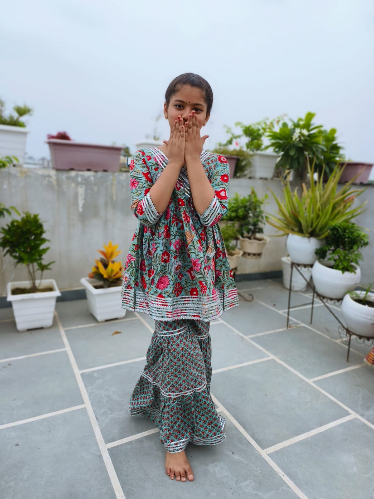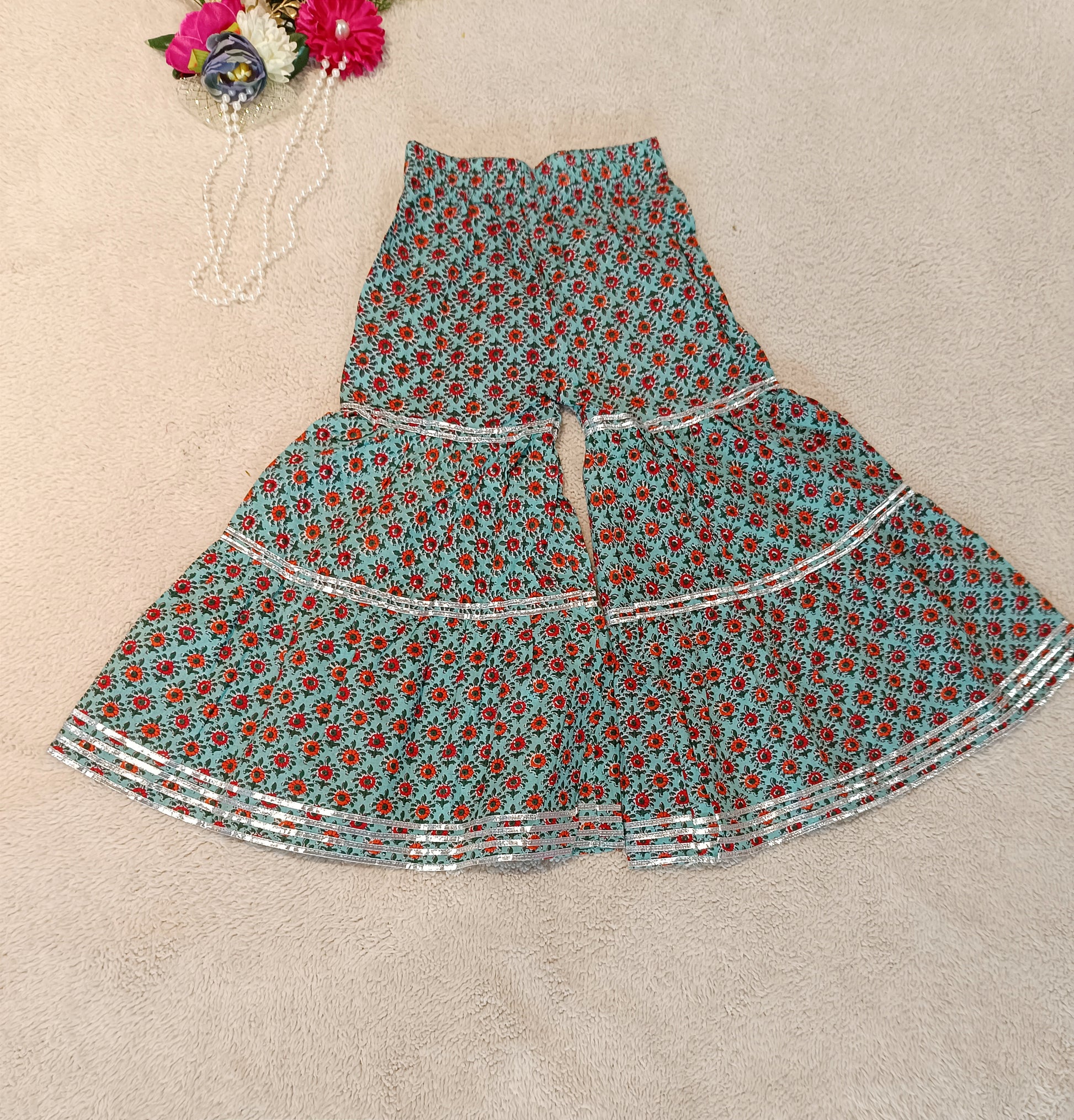 ● Sharara /Bottom : Elegant floor-length sharara featuring a comfortable elasticated waistband for a perfect fit.