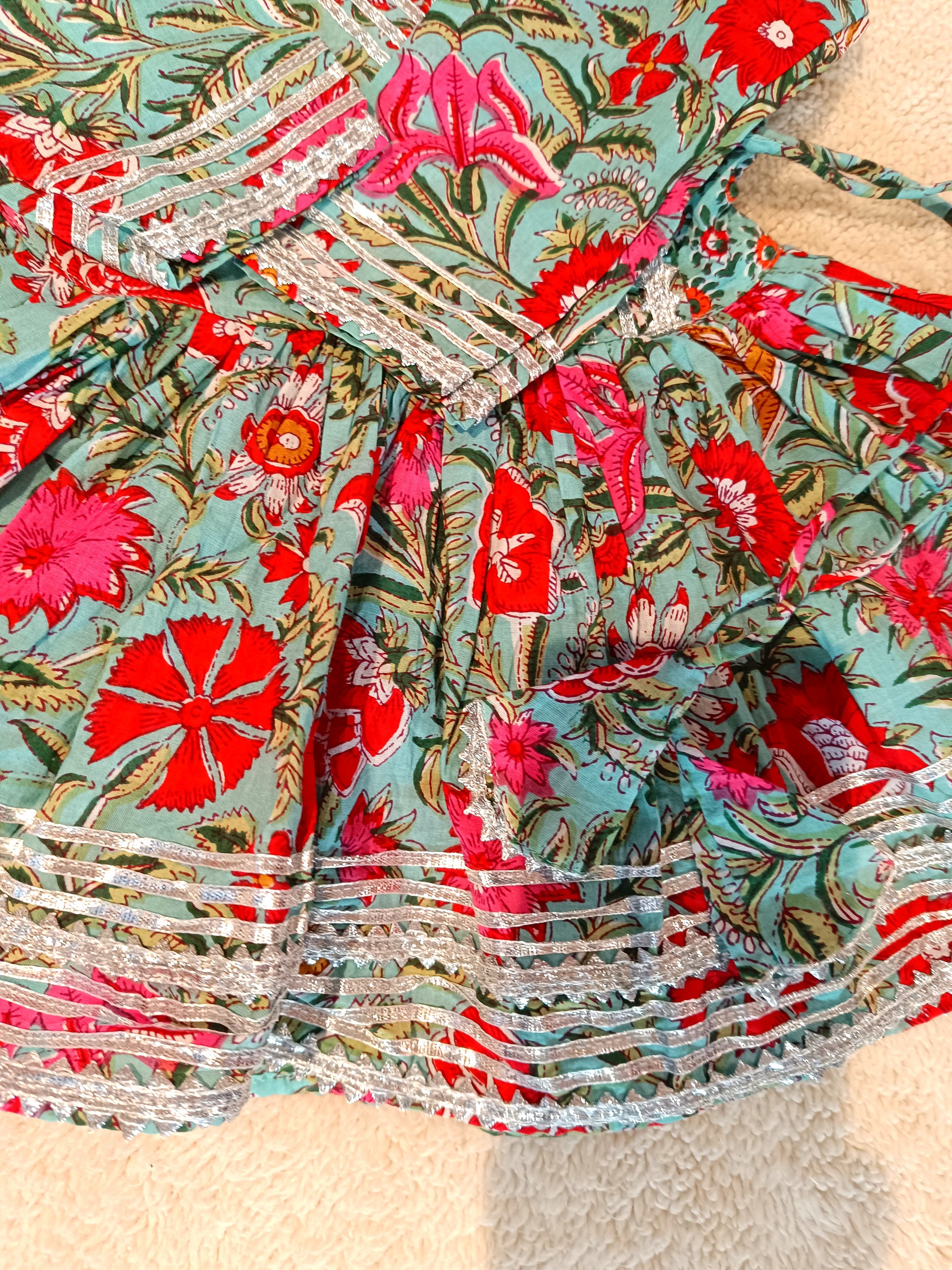 Flower Printed Red & Green Coloured Anarkali Suit with Sharara
