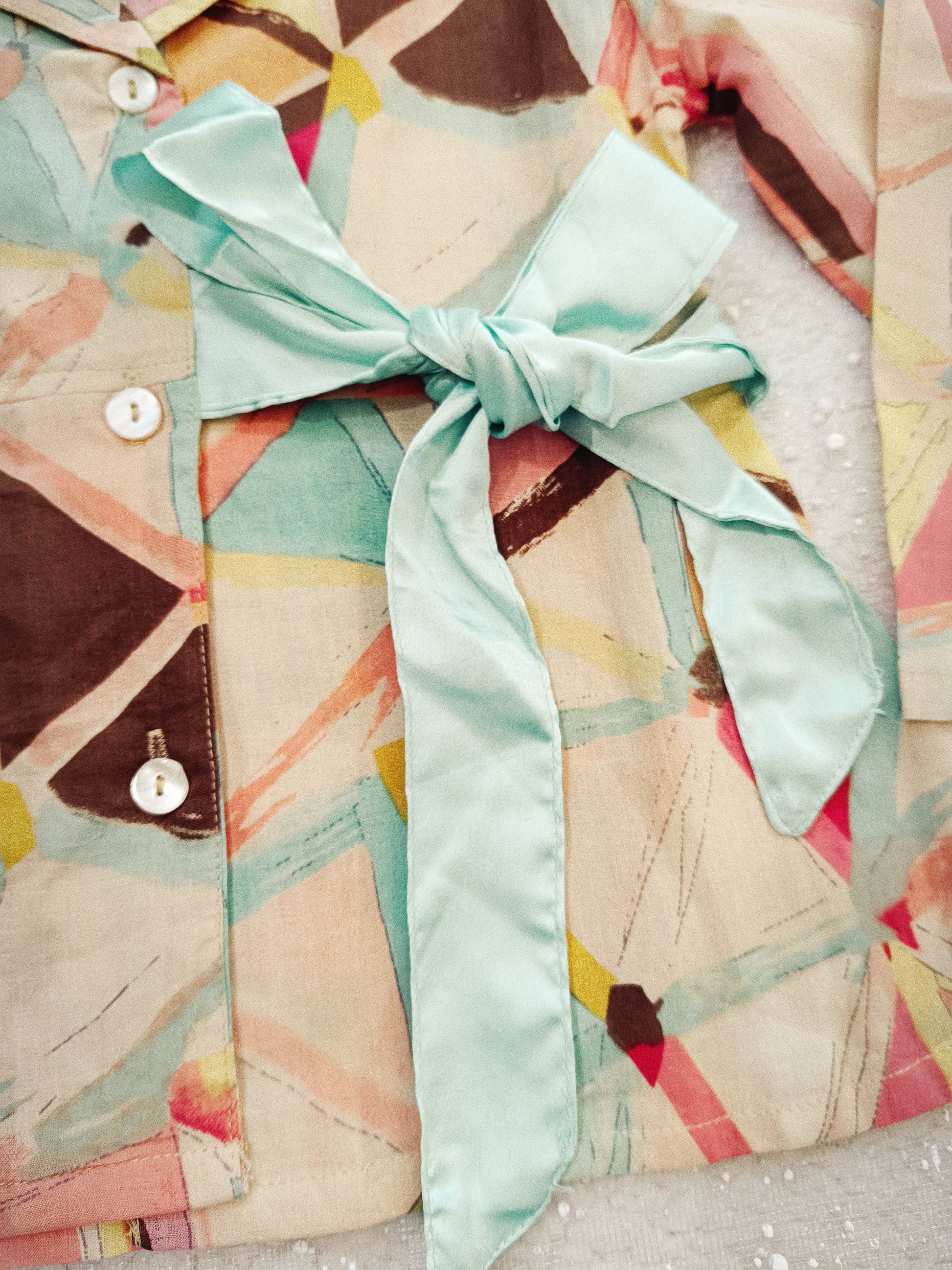 ● Top : Geometric printed top with puff sleeves and front left-side satin tie-ups for added design emphasis.