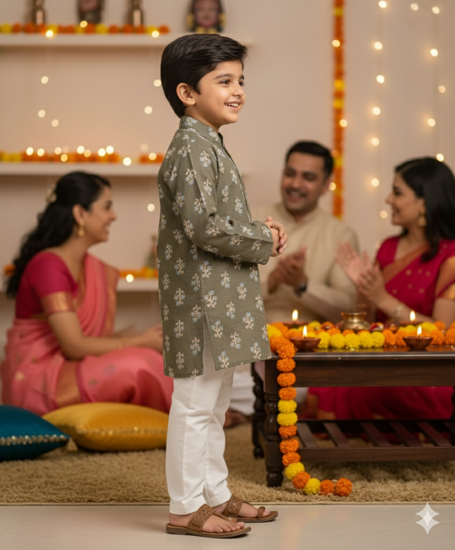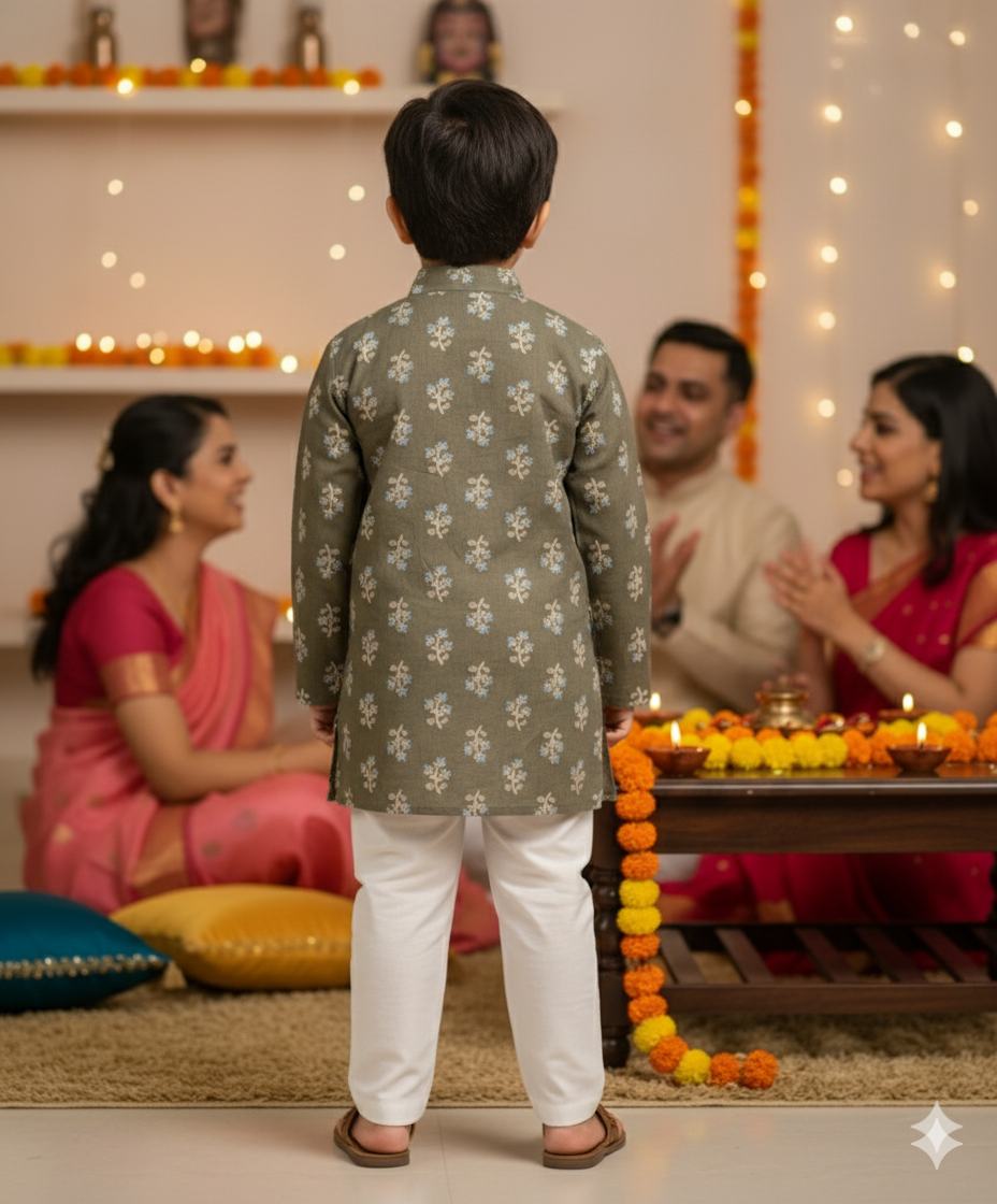 ● Kurta : Block printed fabric with Mandarin collar and front buttons opening