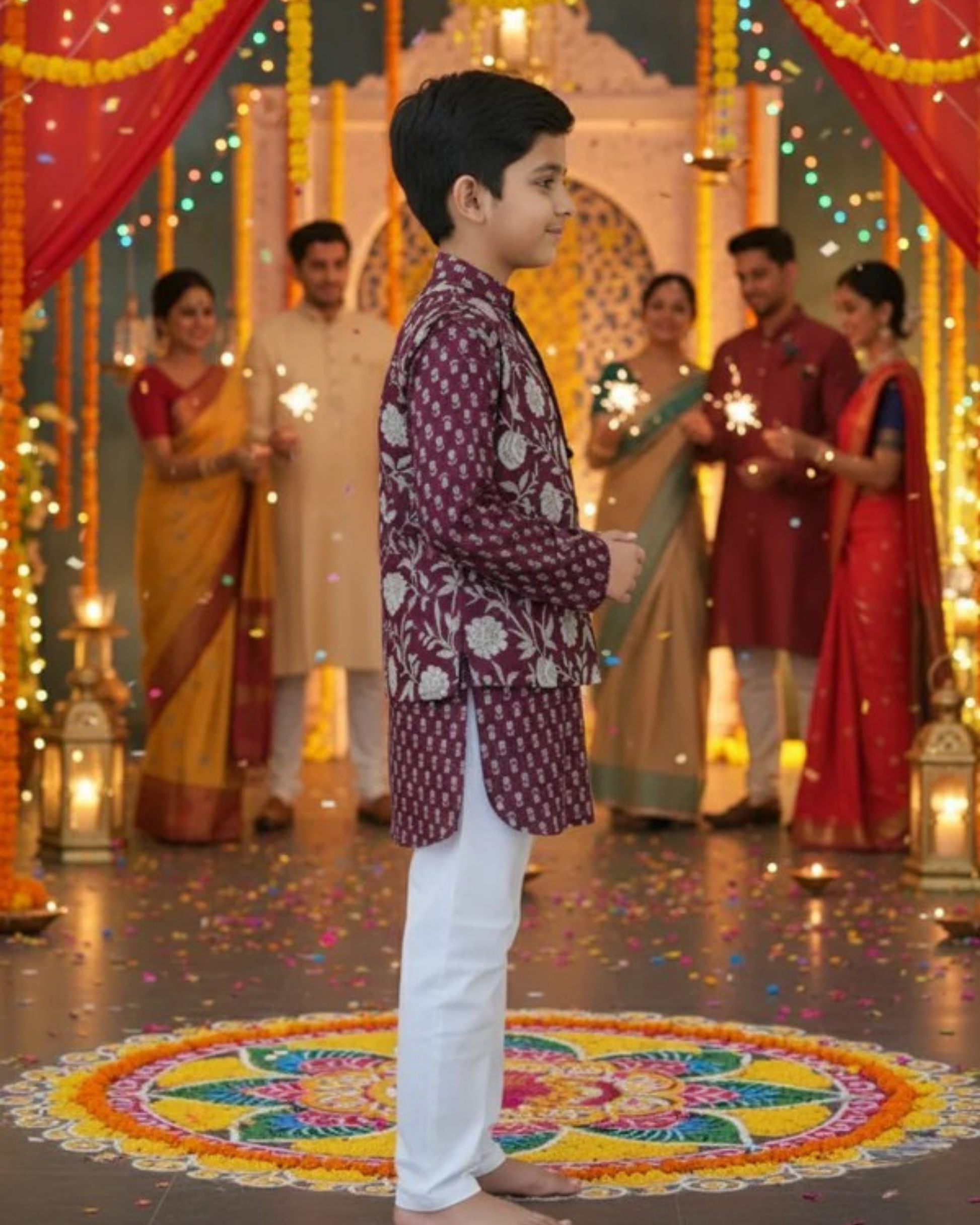 Mehroon Genda fool Jacket with Kurta -Pyjama