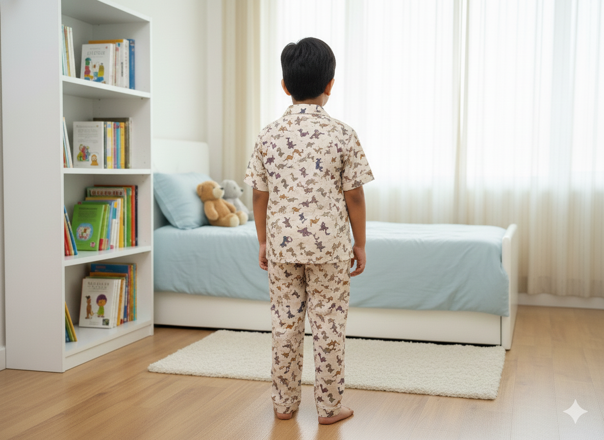 ● Top/ upper: dinasour printed night suit top with front button openings.