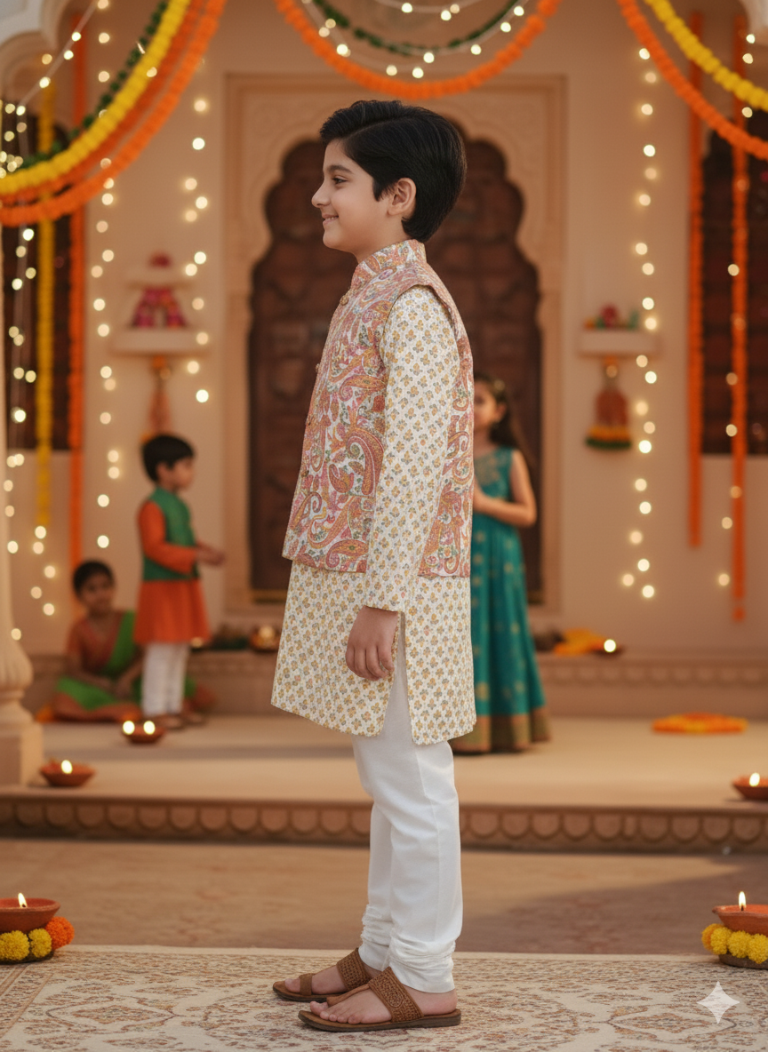 ● Jacket: Paisley Printed fabric with Sleeveless design. Mandarin collar Jacket with front hook opening. Jacket is supported with fusing and cotton lining.