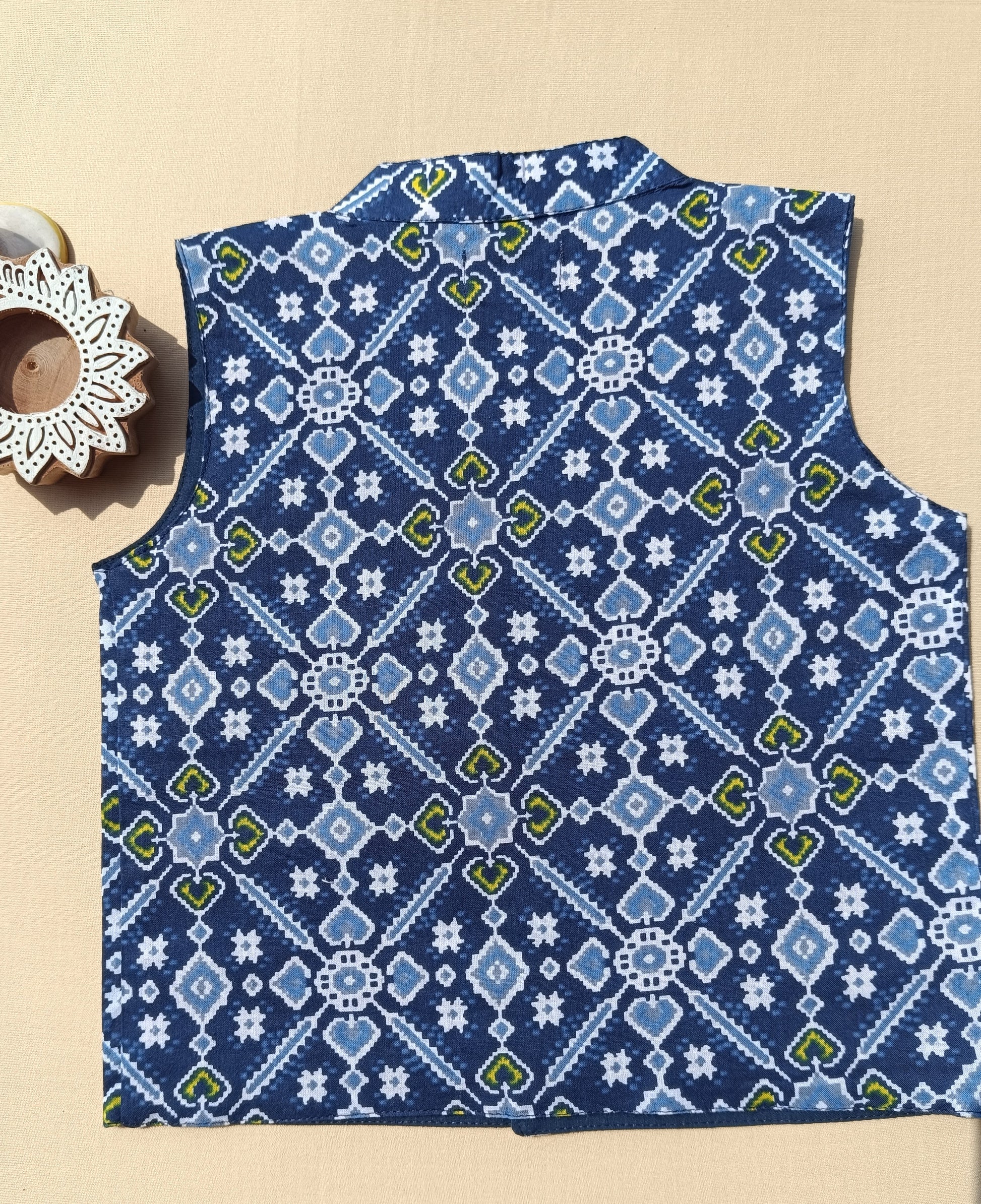 ● Jacket: Red Patola Printed with Sleeveless design. Mandarin collar Jacket with front hook opening. Jacket is supported with fusing and cotton lining.