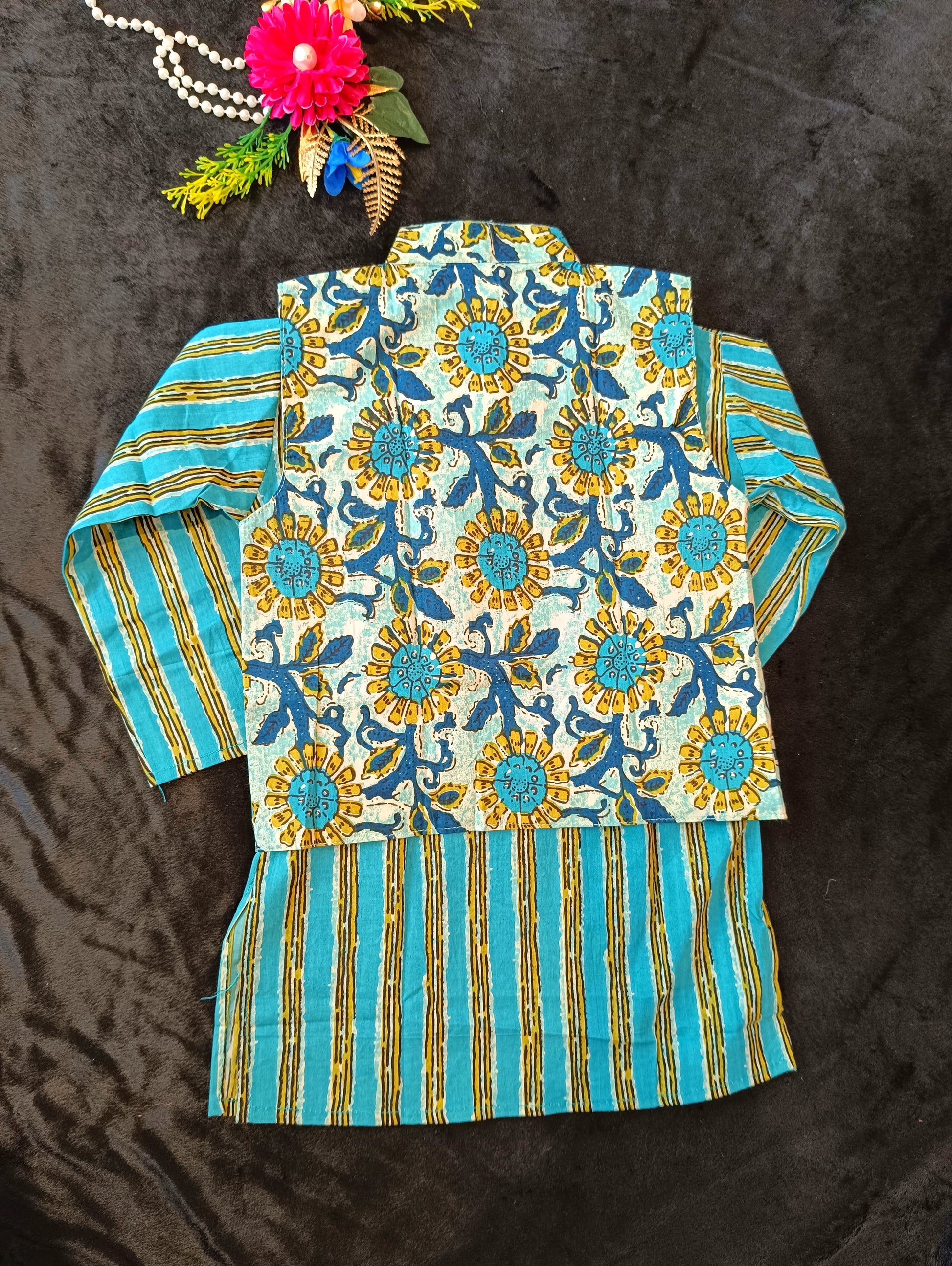 Teal green Sun flower print Jacket with Kurta -Pyjama